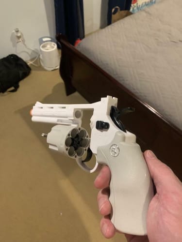 The Raven comes fully equipped with both shell ejection and projectile shooting mechanisms. Simply load the plastic pellets into the shells then into the mag and fire away.